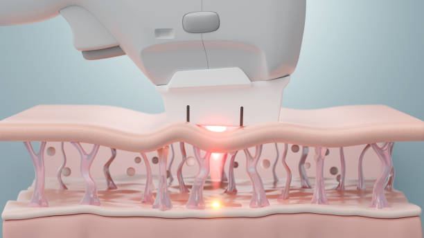 Close up Ultherapy or HIFU treatment shot laser to SMAS to lift and tighten skin, Blue science background. 3D rendering.