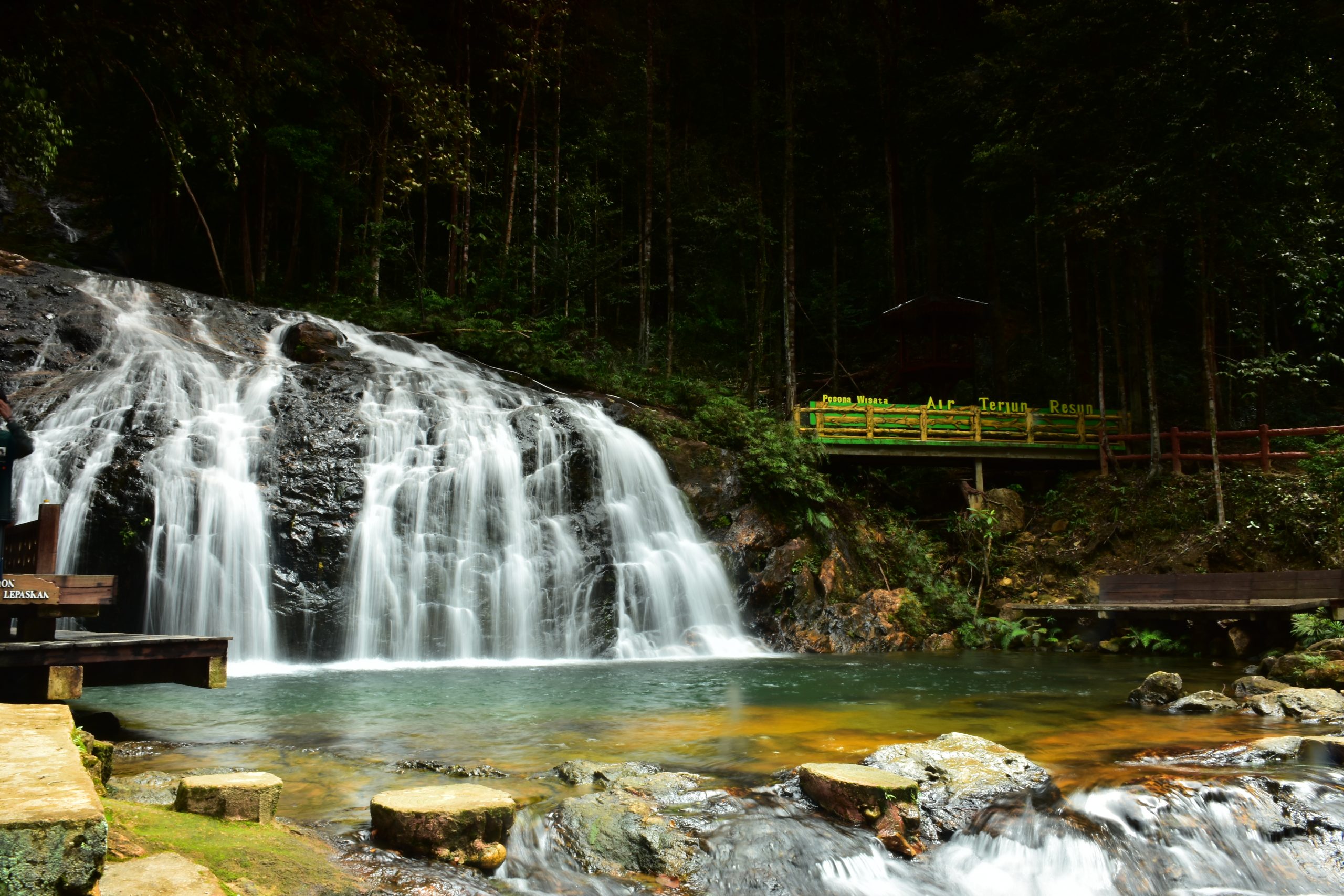 Pemandangan di sekitar air terjun juga sangat asri dengan dikelilingi pohon-pohon yang rindang. Tak hanya itu, Air Terjun Resun ini memiliki beberapa tingkatan air terjun yang membuatnya menjadi semakin menarik untuk dikunjungi, dengan memiliki sudut kemiringan 45 derajat, membuat air tidak langsung terjun ke dasar kolam, tetapi mengalir di dinding landasan.
